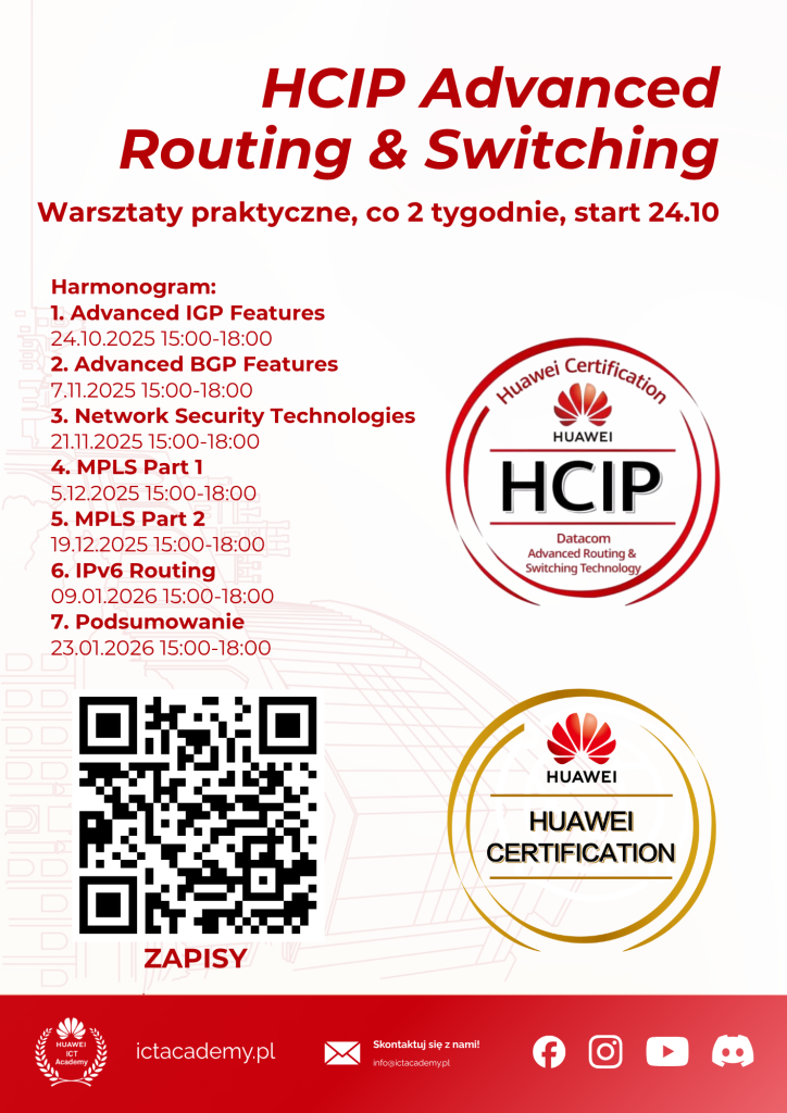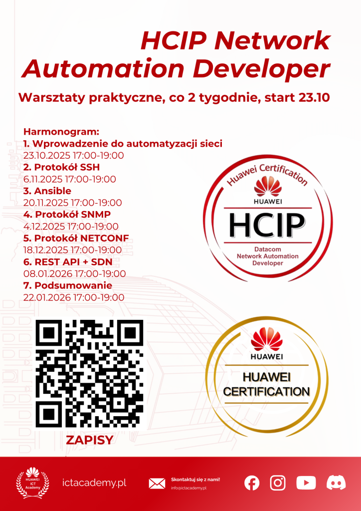 Rusza nowa edycja praktycznych warsztatów przygotowujących do certyfikacji Huawei z zakresu sieci i automatyzacji dla studentów Politechniki Poznańskiej. Zajęcia prowadzone są przez instruktorów i studentów Huawei ICT Academy PP.
