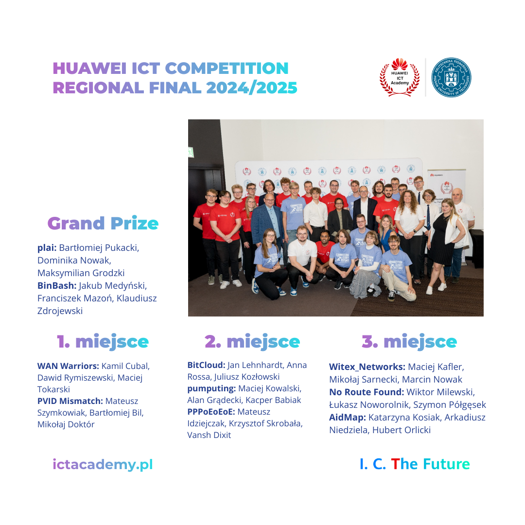 17 lipca 2025 roku w Poznaniu odbyła się ceremonia rozdania nagród za etap regionalny konkursu Huawei ICT Competition 2024-2025, w którym rywalizowały najlepsze zespoły studenckie z całej Europy. Studenci Politechniki Poznańskiej odnieśli ogromny sukces, zdobywając liczne nagrody: